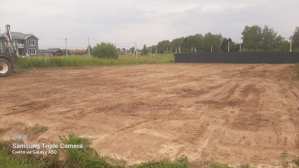 Выполнили черновое и чистовое выравнивание участка площадью 12 соток в Сергиевом Посаде. Участок имел значительные перепады высот — до 40 см — и заросли кустарника по периметру.