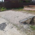 Размечаем площадку под заезд. Выполняем выемку грунта по размерам въезда. Углубляем канаву для укладки трубы с учётом песчаной подушки.